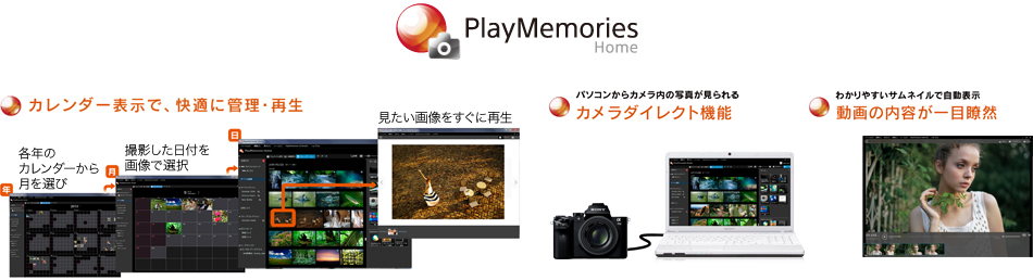 PCソフトウェアPlayMemories Homeを使えば、写真だけでなく動画もカレンダー表示でかんたんに整理・検索・再生が行えます。パソコンをつなぐだけで、カメラ内の映像を取りこまなくても見ることも可能です。さらに、パソコンに取りこんで編集したり、DVDを作成したり、便利な機能を使って楽しくかんたんに管理、活用できます。