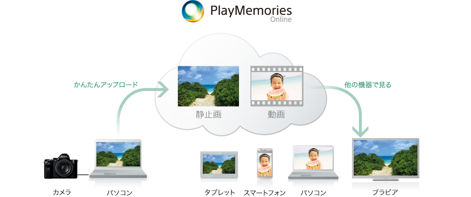 写真や動画をアップロードして、さまざま機器で楽しむことができるクラウドサービスPlayMemories Online。オールシンク機能をオンにすれば、パソコンやスマートフォンに散らばった写真を自動的にクラウドへアップロード(*)してくれます。もちろん、クラウドに保存された写真や動画を友人や家族と共有できます。