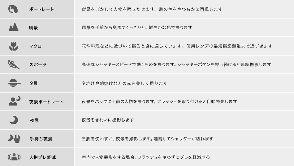 撮影シーンに応じてモードを選択するだけで、カメラが自動的に絞りやシャッタースピードはもちろん、ホワイトバランスや画質まで、シーンに最適になるようコントロールします。「ポートレート」「風景」「マクロ」「スポーツ」「夕景」「夜景ポートレート」「夜景」「手持ち夜景」「人物ブレ軽減」モードの9種類から選択できます。
