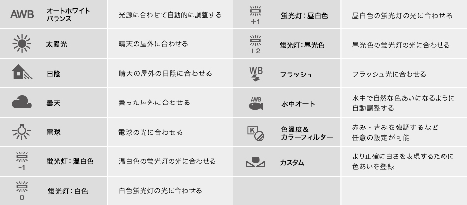 「オートホワイトバランス(AWB)」に設定すれば、カメラがシーンの光源を自動で判定して、色のバランスが最適になるよう調整します。そのほか、赤みや青みを強調したい場合は、「太陽光」「電球」「蛍光灯」などのプリセットモードから選択できます。さらに、「色温度・カラーフィルター」「カスタム」も搭載。またコントロールホイールで、ホワイトバランスをライブビューで確認しながら表現に合わせて色合いを微調整できます。