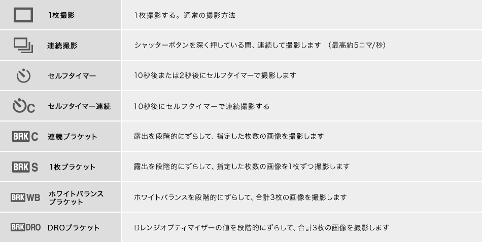 連続撮影(最高約5コマ/秒)のほか、多彩なブラケット機能をドライブモードに搭載。「ホワイトバランスブラケット」やDレンジオプティマイザーの値を段階的にずらす「DROブラケット」、「連続ブラケット」「1枚ブラケット」では、0.3EV、0.5EV、0.7EV、1.0EV、2.0EV、3.0EVステップで3枚または5枚のブラケットが可能です。ハイダイナミックレンジ(HDR)合成のような、デジタルならではのクリエイティブな表現に活用できます。もちろん「セルフタイマー」にも対応しています。
