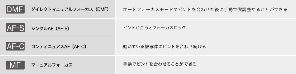 カメラが自動でピント合わせを行うオートフォーカスのほか、手動でピントを合わせるマニュアルフォーカスや、オートフォーカスでピントを合わせた後に手動でピントを微調整できる「ダイレクトマニュアルフォーカス(DMF)」機能も搭載。「DMF」は、AFとMFを瞬時に切り替えられるので、微妙なピント合わせに威力を発揮します。また、オートフォーカスモードは、「シングルAF(AF-S)」と動いている被写体にピントを合わせ続ける「コンティニュアスAF(AF-C)」があります。