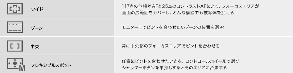 位相差検出方式AFによる117点の測距点と、コントラスト検出方式AFによる25枠のフォーカスエリアが画面の広範囲をカバーし、どんな構図でも被写体をとらえる「ワイド」。左側、中央、右側の3つのゾーンからフォーカスエリアを選べる「ゾーン」。画面中央のみでピントを合わせる「中央」。 ユーザーが任意にピントを合わせる位置を指定できる「フレキシブルスポット」。4種類のフォーカスエリアから、被写体や構図にあわせて選択できます。