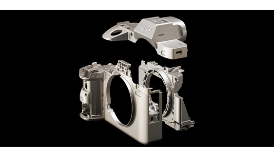 より堅牢なボディを実現するために、トップカバー、フロントカバー、内部フレームに軽量かつ剛性の高いマグネシウム合金を採用し、高い堅牢性と軽量化を両立。さらに、グリップにもマグネシウム合金を使用し、フロントカバーと一体化させることで高い剛性を実現。また、重量のある大口径望遠レンズなどの使用を想定し、マウント固定用のねじ本数を6点にすることで剛性を高めています。