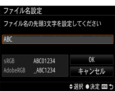 撮影する静止画のファイル名の先頭3文字を変更でき、撮影データの整理や検索をしやすくしました。アルファベット、数字、記号で入力できます。また、ファイルに撮影者名と著作権者名といった著作権情報を書き込めます。