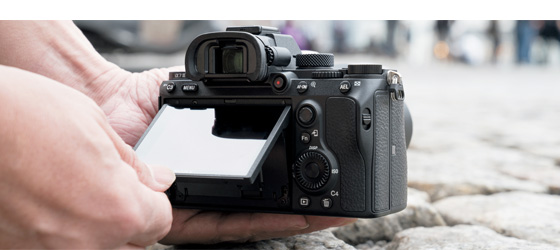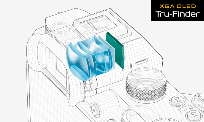 約236万画素の有機ELファインダー「XGA OLED Tru-Finder(トゥルーファインダー)」を搭載。高解像度・高コントラストなだけでなく、階調表現や色再現性にも優れた有機ELの特長を生かして、自然で見やすい映像をファインダー上に表示。ファインダー倍率0.78倍を実現し、隅々までクリアな映像を映し出します。さらに、ツァイス(R)「T*(ティースター)コーティング」の採用により、ファインダーを覗いた際の映り込みも大幅に低減しました。また、電源スイッチをオンにしてからファインダーが表示されるまでの起動時間を短縮し、撮影可能な状態になるまでα7 II比約40%の高速化を実現しています。