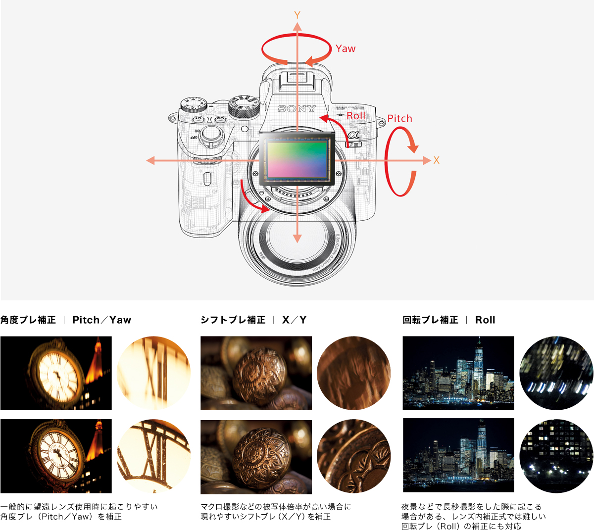 高精度な手ブレ補正ユニットとジャイロセンサーを搭載し、手ブレ補正アルゴリズムを最適化することで、5.0段(*)の補正効果を実現。焦点距離が長くなるほど起こりやすい角度ブレ(Pitch/Yaw)に加え、マクロ撮影時などに顕著に現れるシフトブレ(X/Y)、夜景撮影時や動画撮影時などに目立つ回転ブレ(Roll)の5軸でブレを検出し、高い補正効果を発揮します。静止画撮影中の手ブレ補正効果はライブビュー映像で確認できるため、望遠撮影時やマクロ撮影時でも快適にフレーミングやピントを合わせられます。さらに、手ブレ補正非搭載のEマウントレンズはもちろん、Aマウントレンズなどマウントアダプターを介して装着可能なさまざまなレンズによる撮影にもボディ内手ブレ補正を使用可能。また、動画撮影時も5軸の手ブレ補正をします。