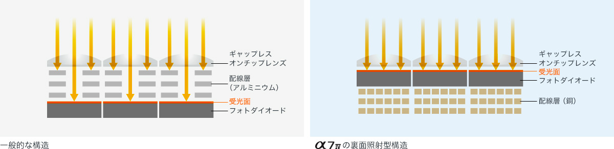 裏面照射型構造に合わせて、伝送速度が速いCu(銅)配線の採用と、包含するAD変換処理の高速化で、センサーが捉えたデータを高速に読み出します。これにより、動画クリエイターの要求にも応える最大4:2:2 10bit Super 35mmでの4K 60p動画記録などを実現しています。