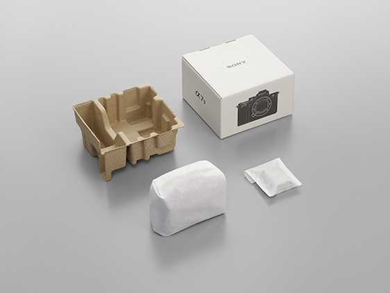 高い緩衝性を維持しながら、包装材の脱プラスチック化(*1)を進めています。α7 Vは、リサイクルしやすい(*2)ソニー独自の再生紙「オリジナルブレンドマテリアル」を採用したパッケージで出荷されます。さらに商品等を包む袋に、植物由来の不織布(*3)を採用し、梱包時に使用されるプラスチックを削減することで、環境負荷を軽減しています。