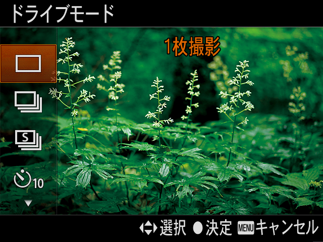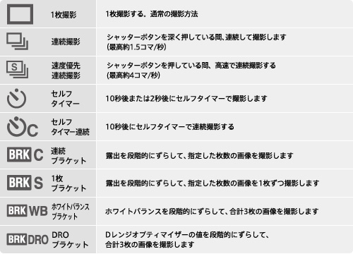 速度優先連続撮影(最高約4コマ/秒)のほか、多彩なブラケット機能をドライブモードに搭載。「ホワイトバランスブラケット」やDレンジオプティマイザーの値を段階的にずらす「DROブラケット」、「連続ブラケット」「1枚ブラケット」では、0.3EV、0.5EV、0.7EVステップで3枚または5枚のブラケットに加え、2.0EV、3.0EVステップで3枚のブラケット撮影も可能です。ハイダイナミックレンジ(HDR)合成のような、デジタルならではのクリエイティブな表現に活用できます。もちろん「セルフタイマー」にも対応しています。