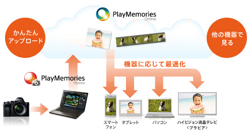 写真や動画をアップロードして、さまざま機器で楽しむことができるクラウドサービスPlayMemories Online。オールシンク機能をオンにすれば、パソコンやスマートフォンに散らばった写真を自動的にクラウドへアップロード(*)してくれます。もちろん、クラウドに保存された写真や動画を友人や家族と共有できます。