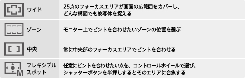 25点のフォーカスエリアが画面の広範囲をカバーし、どんな構図でも被写体をとらえる「マルチポイント」。左側、中央、右側の3つのゾーンからフォーカスエリアを選べる「ゾーン」。 画面中央のみでピントを合わせる「中央重点」。ユーザーが任意にピントを合わせる位置を指定できる「フレキシブルスポット」。4種類のフォーカスエリアから、被写体や構図にあわせて選択できます。