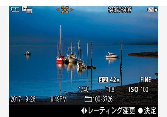 撮影した静止画に5段階でレーティングを設定可能。カスタムキーにレーティング機能を割り当てておくと再生画面上でレーティングできます。また、撮影した画像を誤って消さないように保護するプロテクト機能も搭載。レーティング機能やプロテクト機能が、撮影現場や移動中などの空き時間でのセレクト作業の効率を高めます。