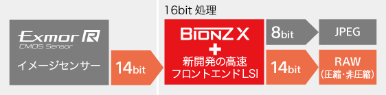 14bitの圧縮/非圧縮RAWフォーマットに対応。イメージセンサー内でA/D変換された14bitのデジタル信号を、フロントエンドLSIとBIONZ X(ビオンズ エックス)のシステム内で一度16bit処理してからRAW画像に14bit出力することで、ハイライトからシャドー部まで、より豊かな階調を表現できます。さらに画像処理システムの進化により、サイレント撮影時や連続撮影時(*1)も14bit RAW出力に対応(*2)しました。