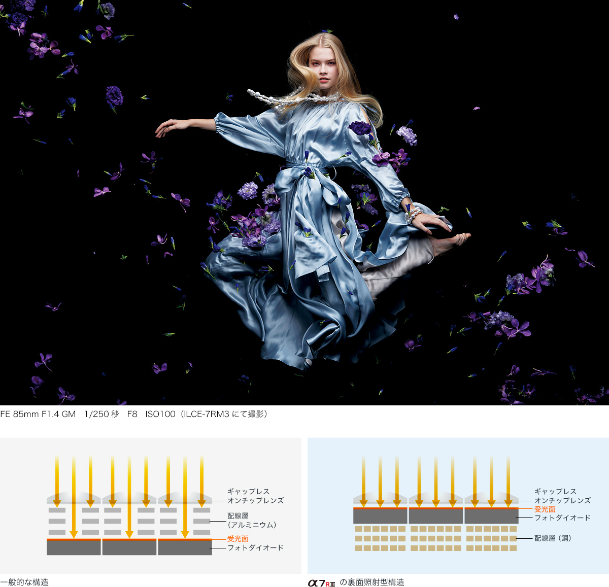 有効約4240万画素35mmフルサイズ裏面照射型CMOSセンサーを搭載。裏面照射構造による高い感度特性に加え、ギャップレスオンチップレンズ構造やARコーティング(反射防止膜)付きシールガラスなど、ソニーのイメージセンサー技術を結集。高解像度、高感度での低ノイズ性能、広いダイナミックレンジをあわせ持つセンサーが撮影領域を拡大します。