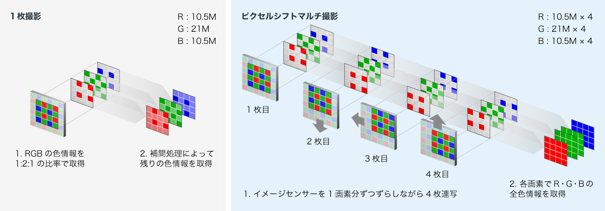 本機での通常の1枚撮影時は、画素ごとにR・G・Bのうち1色分の色情報を取得し、残りの2色分の色情報を周辺画素の情報から補間処理しています。それに対し、ピクセルシフトマルチ撮影では、有効約4240万のすべての画素でR・G・B の全色情報を取得し、補間処理をせずに直接合成して画像を生成します。それにより、色モアレ(偽色)の発生を最小限に抑え、より高精細かつ忠実な質感描写を実現します。撮影した画像は、ソニー純正のソフトウェア「Imaging Edge」で合成・現像できます。