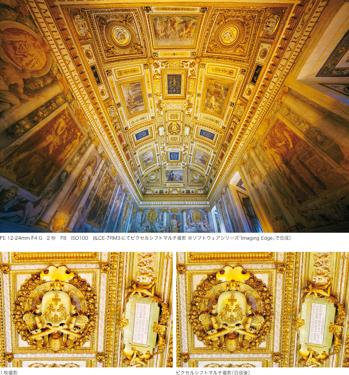 ピクセルシフトマルチ撮影は、ボディ内手ブレ補正機構を高精度に制御することで、イメージセンサーを正確に1画素分ずつずらして計4枚の画像を撮影。専用のソフトウェアで、撮影した4枚の画像が持つ約1億6960万画素(*2)分の膨大な情報から、解像感に優れた1枚の画像を生成することができます。被写体の持つ細部の色や質感、空気感まで忠実に再現できるため、建築物や美術品などの記録・保管用の画像撮影に最適です。