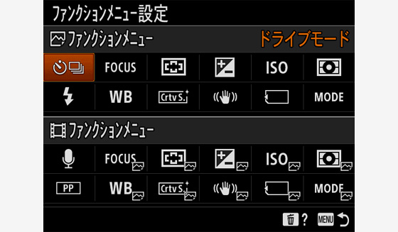 ファンクション(Fn)ボタンで呼び出す機能を、静止画と動画撮影時でそれぞれ分けて登録が可能になりました。