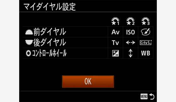 よく使う機能を前/後ダイヤルとコントロールホイールにそれぞれ割り当てて、その組み合わせを「マイダイヤル」として3つまで登録することが可能です。登録した「マイダイヤル」は、あらかじめ設定したカスタムキーを押すことで、すばやく呼び出したり、切り換えたりできます。