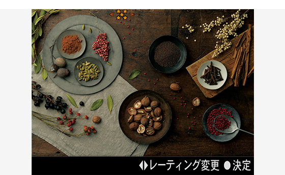 撮影した静止画に5段階でレーティングを設定可能。カスタムキーにレーティング機能を割り当てておくと再生画面上でレーティングできます。また、撮影した画像を誤って消さないように保護するプロテクト機能も搭載。レーティング機能やプロテクト機能が、撮影現場や移動中などの空き時間でのセレクト作業の効率を高めます。