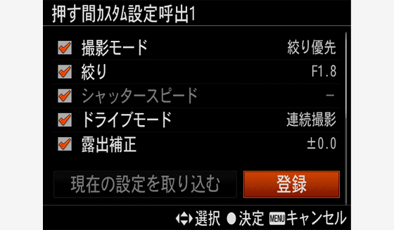 撮影時の設定値(シャッタースピード、絞り値、フォーカスエリア)をあらかじめカスタムキーに登録しておき、キーを押している間だけ一時的に呼び出して使うことができます。キーを離すと元の設定値に戻るため、状況が変化しやすいスポーツシーンなどの撮影に適しています。また、「AF被写体追従感度」の設定も割り当てられるようになりました。