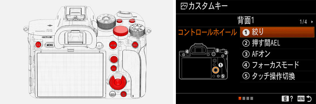 頻繁に使うメニュー項目を最大30個までカスタマイズ登録できる、マイメニュー登録機能を搭載。使用頻度の高い順に入れ換えたり、使用しなくなった項目の削除も可能なので、撮影者の使い勝手に合わせて最適なメニューを作成できます。また、検索しやすい新しいメニュー構成を採用。グループ名やページ数も上部に追加し、目的の項目を探しやすくしています。さらにカスタムキーの設定画面にイラストを用いることで、設定項目が認識しやすくなりました。