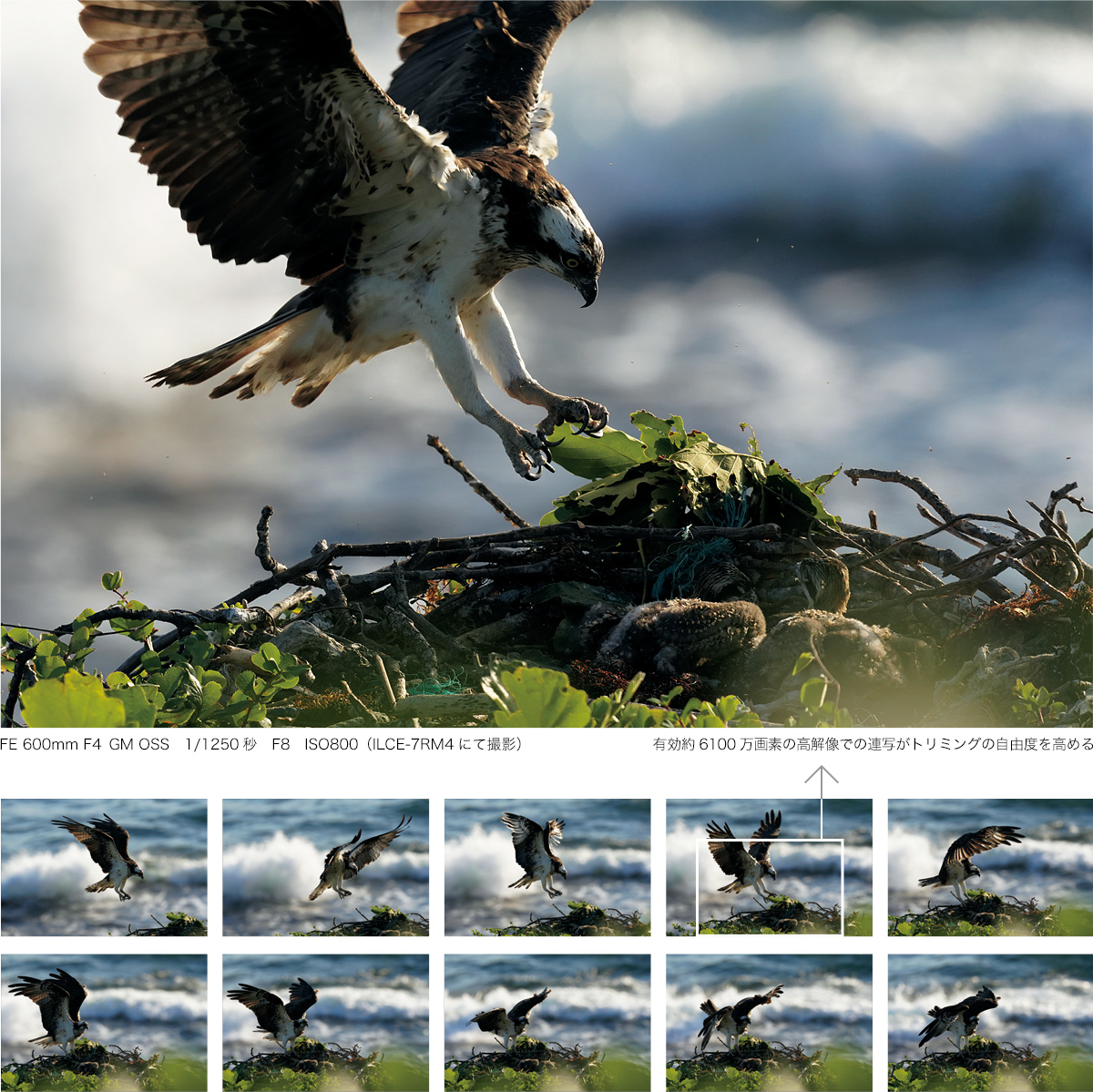 無音・無振動の電子シャッターを用いたサイレント撮影(*2)機能を搭載。サイレント撮影時もフル解像度でAF/AE追随最高約7コマ/秒(*1)の連写が可能です。無音のため静寂が求められる野生動物の撮影などでも決定的な瞬間を逃さず、またメカシャッターによる振動がないため、高解像性能を最大限に生かした撮影ができます。