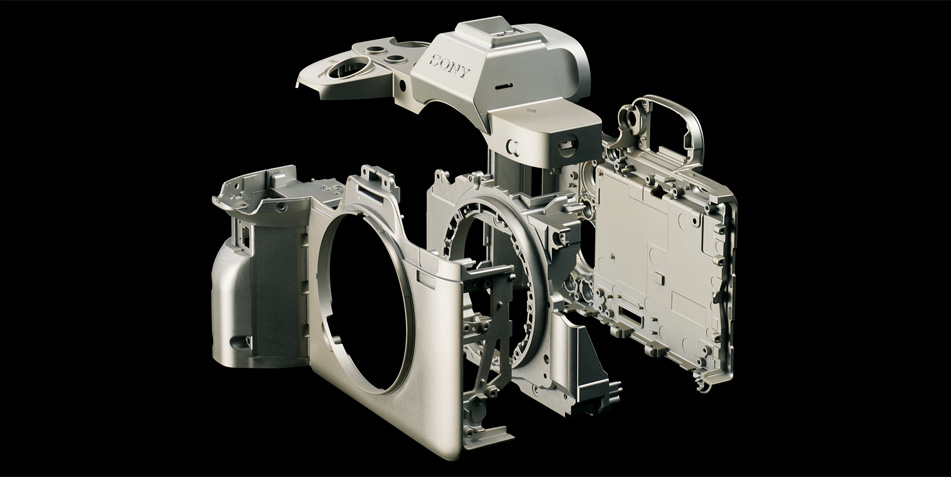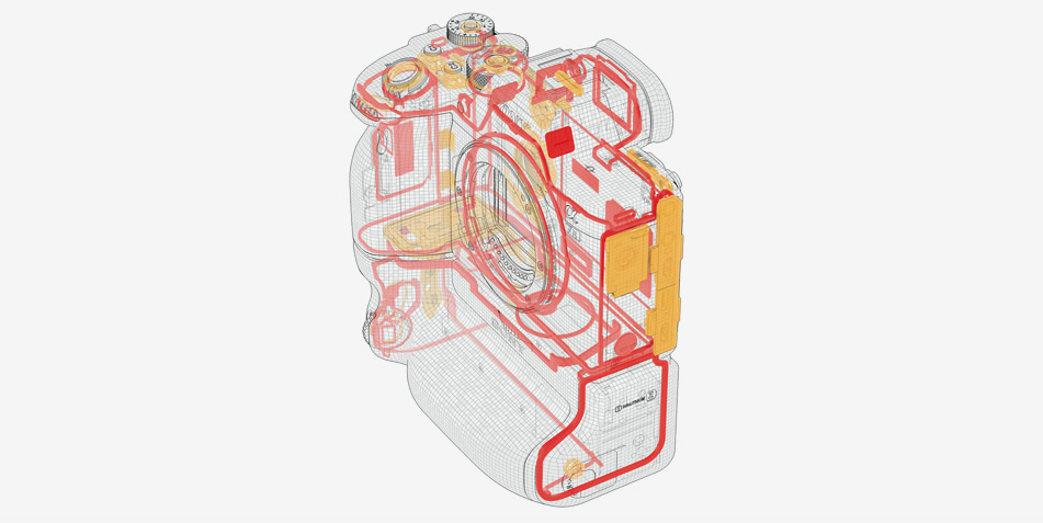 過酷な環境下での使用にも耐えられる堅牢なボディを実現するために、トップカバー、フロントカバー、内部フレーム、リアカバーに至るまで軽量かつ剛性に優れたマグネシウム合金を採用。高い堅牢性と軽量化を両立しています。また、マウント固定用ねじを6本使用し、マウント部の剛性を強化。超望遠レンズなどさまざまなレンズの使用に配慮しています。