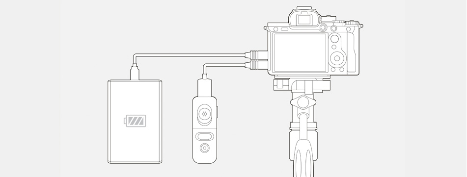 USB Type-C(R)端子およびマルチ/マイクロUSB端子での給電に対応。モバイルバッテリーなどから電力を供給しながら撮影できるので(*)、長時間の撮影も安心です。また、USB Type-C(R)端子での給電やPCリモート撮影中も、リモートコマンダーなどのマルチ/マイクロUSB端子対応アクセサリーを同時に使用できます。