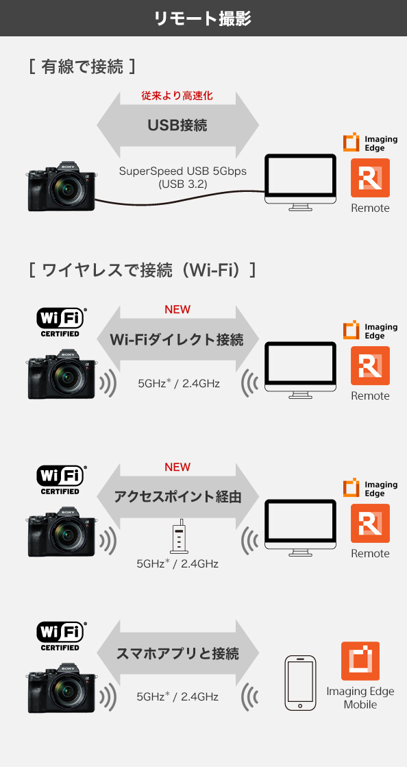 スタジオ撮影では、データを即座にPCへ転送し大型モニターなどで関係者で確認できるPCリモート接続(テザー撮影)機能が、現場でのスムーズなワークフローに不可欠です。本機では、プロユーザーからの要望が高かったワイヤレス撮影を新たにサポート。特別なアクセサリーが必要ないため、カメラマンの動きを制約することなく、屋外での撮影セッティングの自由度も高めます。撮影にはソニー純正のソフトウェア「Imaging Edge」のアプリケーション「Remote(Ver. 2.0)」を用いてカメラとPCをWi-Fi接続します。周波数帯域は2.4GHz/5GHz(*)から選択可能。カメラとPCをWi-Fiでダイレクト接続したリモート撮影に加え、アクセスポイント経由でのワイヤレスリモート撮影など環境に合わせて選べます。通信可能距離が長いため、広い場所での接続時などに便利です。