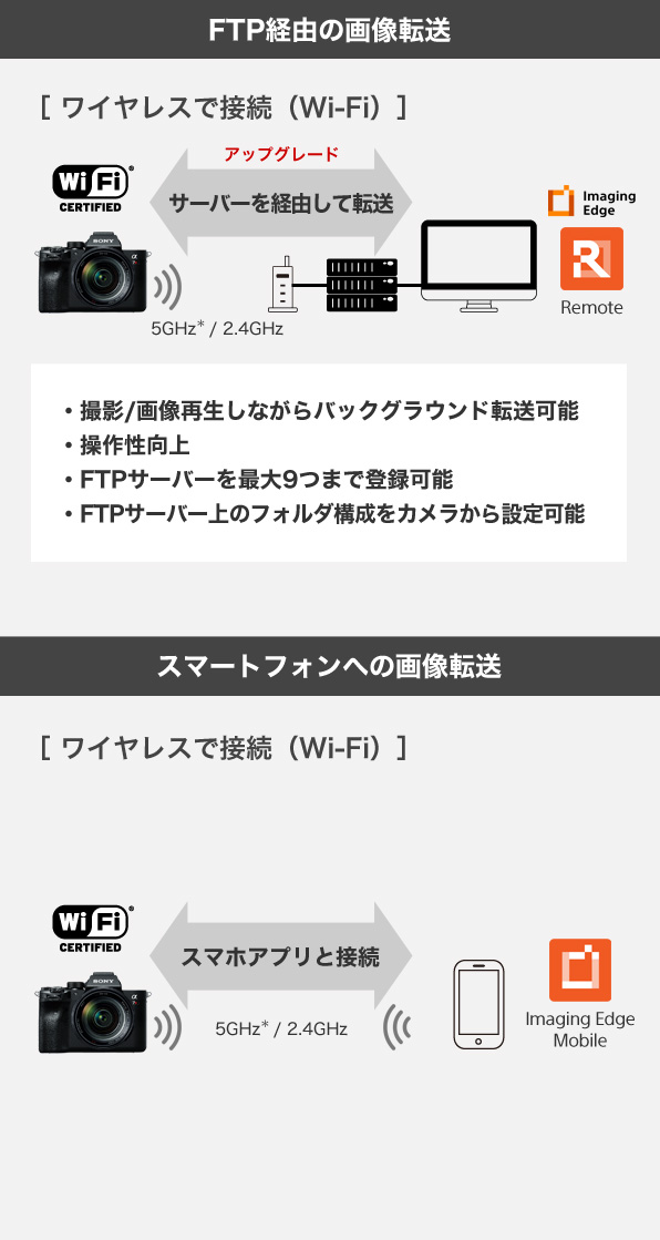 撮影した静止画ファイルを選択し、指定した遠隔のFTPサーバーにWi-Fi経由で転送することが可能です。また、FTPS(File Transfer Protocol over SSL/TLS)に対応し、SSLまたはTLSで暗号化したデータを送受信できるため、高いセキュリティーを確保しています。さらに本機では、プロユーザーからの要望に応え、カメラ側設定やFTPサーバーの登録などさまざまな操作性が向上。5GHz帯域(*1)による安定したデータ転送(*2)も可能にしています。