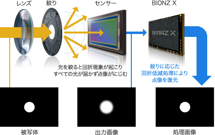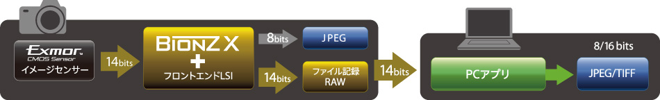 イメージセンサー内でAD変換された14bitのデジタル信号を、フロントエンドLSIと「BIONZ X」のシステム内で一度16bit処理してから、RAW画像に14bit出力することで、より豊かな階調表現と高画質を実現します。