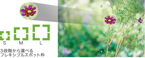 画面上の任意の場所を選択してピント合わせできるフレキシブルスポットのスポット枠サイズが3段階から選択可能。スポット枠が狙った被写体よりも大きいためにピントが定まらない場面でも、スポット枠を小さくし、より厳密なピント合わせができます。