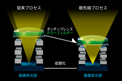 1画素あたりの回路設計を最適化し、光を取りこむフォトダイオードの受光面積を大幅に拡大。高集光プロセス技術と組み合わせて、高感度・低ノイズ化だけでなく、ダイナミックレンジの拡大にも貢献しています。