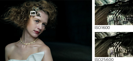 独自の「オンチップ・カラムAD変換」方式を採用し、センサーチップ内でADコンバーターが一括変換を行い、ノイズの発生を抑えつつデータを高速転送。さらに、アナログ段階とデジタル変換後の2回、ノイズ成分の除去を行う「デュアルノイズリダクション回路」の搭載により、高感度撮影時でも圧倒的な低ノイズを実現。常用ISO100-102400(拡張ISO下限ISO50、上限ISO409600)(*)の幅広い感度領域で、解像力と低ノイズを高いレベルで両立しました。さらに、高速連写した4枚の画像を合成して、設定したISO感度から最大約2段分のノイズ低減効果が得られる「マルチショットNR(ノイズリダクション)」機能を搭載しています。