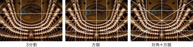 液晶画面にグリッドラインを表示できるので、水平や垂直の傾きを補正しながら、緻密なフレーミングが可能です。グリッドラインの表示は「3分割」「方眼」「対角+方眼」の3種類から選べます。