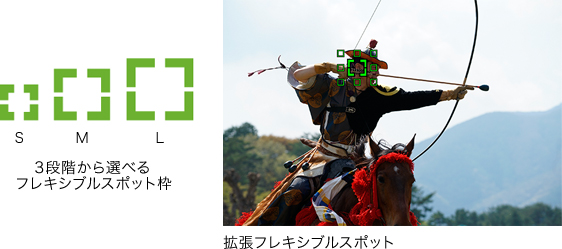 画面上の任意の場所を選択してピント合わせできるフレキシブルスポットのスポット枠サイズを3段階から選択可能。スポット枠が狙った被写体よりも大きくピントが定まらない場面でも、スポット枠を小さくし、より厳密なピント合わせができます。さらに「拡張フレキシブルスポットAF」にも対応。選択したフォーカスポイントから被写体が一時的に外れても、その周辺のフォーカスポイントに自動で切り換わり、被写体を捉えて再びピントを合わせます。