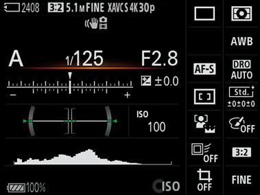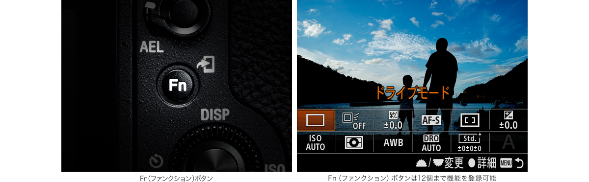 α99で採用されている「クイックナビプロ」を搭載。カメラの設定用画面に遷移する必要がなく、Fnボタンを押せばダイレクトに項目の設定・変更ができるため、撮影中でもより迅速・確実に意図した設定値の選択が可能です。また、液晶画面で瞬時にパラメーターを確認できるだけでなく、前後の選択肢まで表示されるため、コントロールダイヤルですばやく直感的に操作できます。