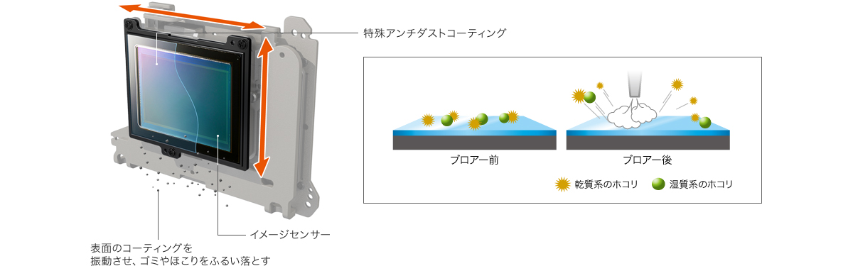 イメージセンサー表面に特殊コーティングを採用。使用環境での温度や湿度などの変化で除去が難しくなるゴミやほこりの付着を抑制し、除去効果を高めます。また、クリーニングモード実行時に自動でセンサーを振動させるアンチダスト駆動により、センサーからゴミやほこりを除去します。