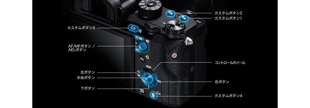 撮影者の操作やこだわりに応えるカスタマイズ機能も充実。AELボタン、ISOボタン、AF/MFボタン、カスタムキー、動画撮影のスタート/ストップなどを含め、使用状況や好みに合わせて機能を自由に割り当てられるボタンを10個搭載(*)。65項目の機能からそれぞれ登録でき、よく使う機能を瞬時に呼び出せます。