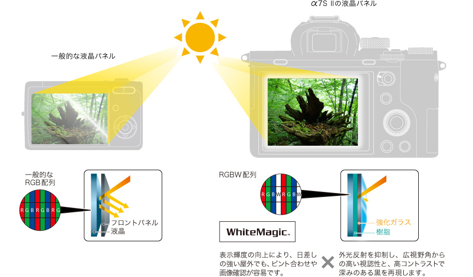 約122.9万ドットの大画面3.0型ワイド「エクストラファイン液晶」に、明るく見やすいWhiteMagic(TM)ディスプレイを採用。画素に白画素を追加し画面をより明るくするWhiteMagic技術により、輝度を高め、屋外などの明るいシーンでも高い視認性を実現しています。さらに、晴天の屋外でも液晶画面が見やすい「屋外晴天」モードも搭載しています。