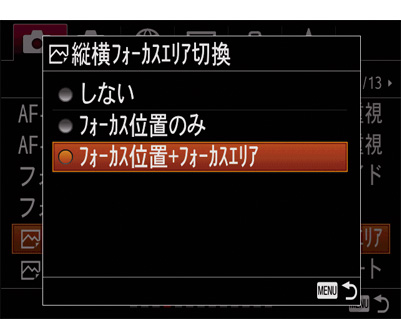 カメラを構えるポジション(縦位置/横位置)ごとに、フォーカスエリアとフォーカス枠の位置を使い分けるかどうか設定することができます。スポーツやポートレート撮影など、カメラのポジションを頻繁に変えながら撮影する場合に有効です。