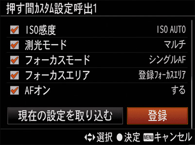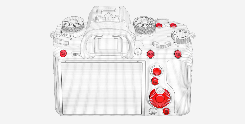 ※ コントロールホイールは、「下選択」で1ボタン、「左右選択」で1ボタン、「センターボタン」で1ボタンとカウント。また、「フォーカスホールドボタン」の搭載されているαレンズを装着時には、そのボタンにも機能の割り当てが可能です