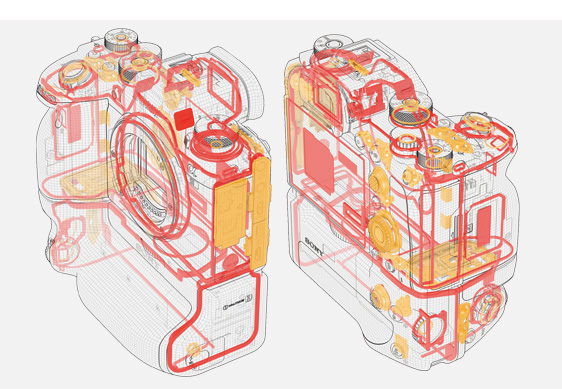 α9 IIでは、多くのプロユーザーからのフィードバックをもとに、α9よりもさらに防塵・防滴(*)に配慮し、ボディ外装の随所に工夫を施しました。外装の合わせ目全周や電池蓋にシーリング構造を採用したほか、想定外の浸水にも耐えられるようメディア端子蓋を二重蓋構造のスライド機構に変更。ゴミや水滴の浸入経路となりえる箇所を徹底的に見直し、屋外の厳しい撮影環境での使用にも耐えうる堅牢なボディ構造を実現。α9から大きくサイズを変えることなく、高い信頼性を確保しています。また、レンズ、縦位置グリップ「VG-C4EM(別売)」、フラッシュユニットも、防塵・防滴(*)に最大限配慮した設計となっています。