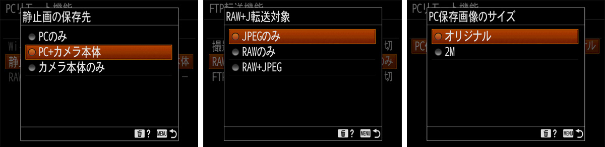 「Remote Camera Tool」「Imaging Edge」ともに、撮影環境に応じて、静止画の保存先を「PCのみ」「PC+カメラ本体」「カメラ本体のみ」から選択できます。また、高速転送を実現するために、RAW+JPEG撮影時にPC側へJPEGファイルのみ転送する設定が可能。PCへの保存画像サイズは、オリジナル画質と2Mサイズ(JPEG)から選択できます。