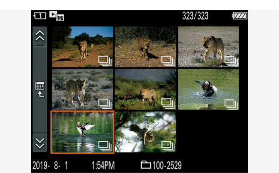 再生時のインデックス画面の一覧性が向上し、撮影画像を連写したグループごとに表示できます。連写グループ単位での削除やプロテクトもできるため、撮影現場ですぐに写真の選別や削除をしたい場合に有効です。