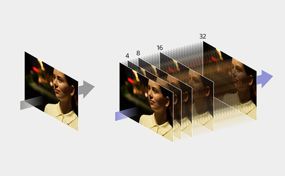 コンポジットRAW撮影では、一度にRAW画像を複数枚連写撮影し、PC上でImaging Edge Desktop(TM)を使って画像をコンポジット合成し、中高感度でも解像を維持しつつ低ノイズな、JPEG、TIFF、そしてRAW形式で出力できます。高速なシャッタースピードが必要なワイルドライフや光量が不足しているシーンでのポートレート撮影で、ISO感度を高く設定した場合でも、ノイズを抑えた高画質な映像が得られます。一度の撮影で事前に4枚/8枚/16枚/32枚から設定しておいた複数枚の画像を撮影しますが、最高約120コマ/秒(*2)の高速撮影により、1コマの撮影と同じ感覚で手持ち撮影をすることができます。さらに、手持ちでコンポジットRAW撮影を行った場合は、手ブレを生かして複数の画像を撮影しPC上で合成することで、偽色やジャギーの低減にも寄与します。