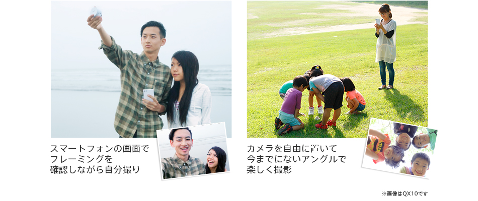 Wi-Fi(R)で通信可能な範囲であれば、スマートフォンから離して使用することもできます。自分撮りのときは、スマートフォンでアングルやピント、フレーミングなどの確認ができて便利です。また、通常のカメラやスマートフォンにはできない自由なアングルでの撮影も楽しめます。