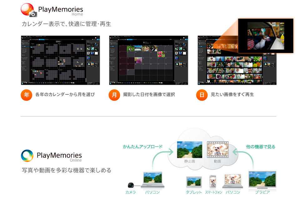 PCソフトウェアPlayMemories Homeを使えば、写真や動画をカレンダー表示でかんたんに整理・検索・再生。さらに、パソコンに取りこんだ写真の編集やDVD作成なども、便利な機能を使って手軽に楽しめます。クラウドサービスPlayMemories Onlineを利用すれば、アップロードした写真や動画をさまざまな機器で楽しむことが可能。オールシンク機能をオンにすれば、パソコンやスマートフォンそれぞれに保存している写真を自動的にクラウドへアップロード(*)してくれます。また、PlayStation(R)3で写真や動画の管理・共有ができるPlayStation(R)3専用ソフトウェアPlayMemories Studioも用意しています。