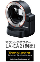 ソニーが独自に開発した「トランスルーセントミラー・テクノロジー」を搭載した、マウントアダプターLA-EA2(別売)を使えば、NEX-3NでもすべてのAマウントレンズ(*)が使えます。静止画・動画を問わず、高速・高精度なTTL位相差検出方式AFが働くので、決定的な瞬間を逃さずとらえられます。豊富なαレンズ(Aマウントレンズ)を活用すれば、表現の幅がさらに広がります。